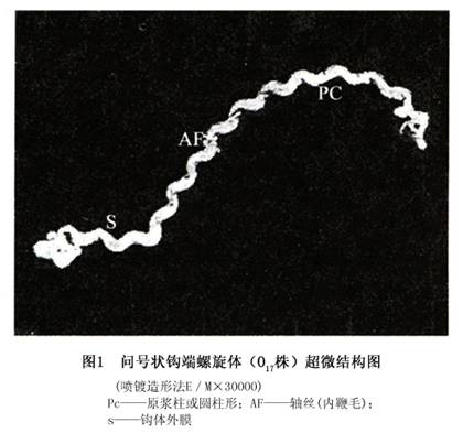 钩体在形态学上具有特殊的外形及特殊的结构。菌体非常纤细,螺旋盘绕细致,规则而紧密,一般长约6~10μm,有12~24个螺旋,直径0.1~0.2μm,在靠近菌体的一端或两端常弯曲成钩状,在暗视野显微镜下,钩体沿长轴作快速旋转运动,可通过0.1~0.45μm微孔。因钩体革兰染色阴性,不易被苯胺类染料着色,故常用镀银染色法来检查组织中存在的钩体。在电镜下观察,钩体的基本结构是由圆柱形菌体、细长轴丝和透明外膜所组成。圆柱形菌体为一外具细胞壁,内充满原生质的螺旋状结构。轴丝有2条,细而弯曲,直径20~34μm,与圆柱体互相缠绕,其末端嵌入圆柱形菌体末端,称终端结与插盘。轴丝是一种细菌鞭毛相似的运动器官,其冲动来自终端结与插盘。圆柱形菌体与轴丝的外面,包以一层薄而透明的外膜,外膜具有抗原活性,与相应抗体能产生凝集现象。外膜具有免疫原性,将外膜免疫动物,能抵抗强毒株的攻击而获得保护(图1)。